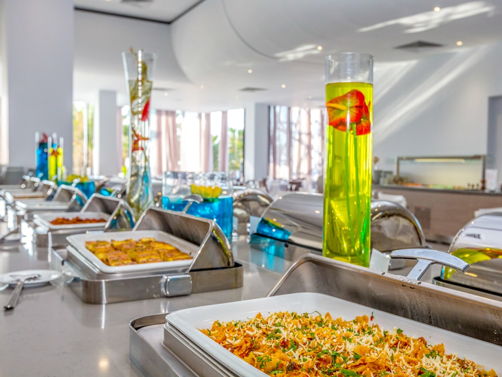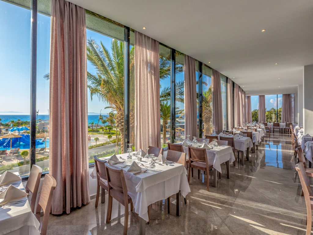 Hovedmåltiderne serveres i den livlige hovedrestaurant og består af bufféter med både græske og internationale retter, hvoraf nogle tilberedes på show-cooking-stationer i restauranten.