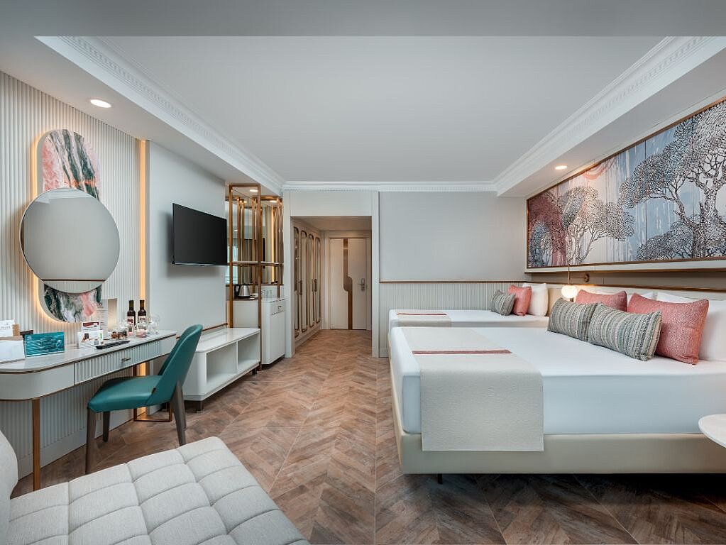 På Delphin Palace bor du i lyse, omhyggeligt indrettede værelser med skønne detaljer og behagelige materialer.