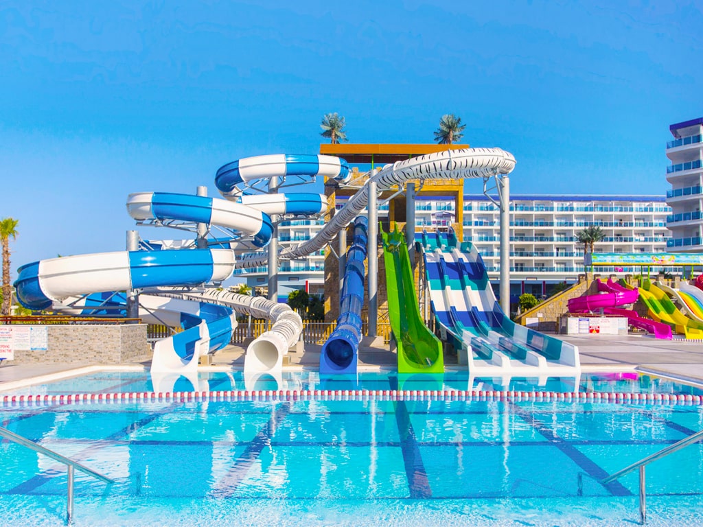 Store børn og legesyge voksne vil elske beach clubbens store vandpark, med ikke mindre end 12 fantastiske vandrutsjebaner. For mindre børn er der flere separate børnepools, blandt andet med et sejt piratskib, mindre vandrutsjebaner og andet sjovt vandplaskeri. Rundt om den ene børnepool løber en lille lazy river, hvor de mindste kan flyde rundt i deres baderinge.