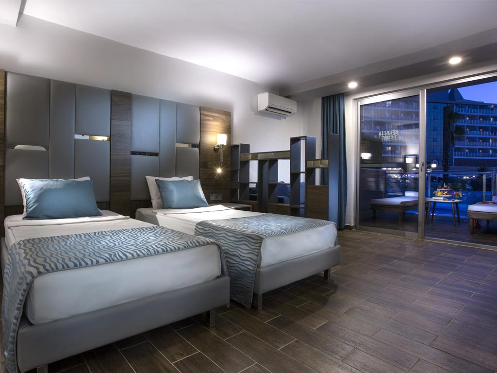 Eftalia Ocean er perfekt til dig, der rejser med børn, og som ønsker at samle din store familie i rummelige og moderne værelser. Værelserne er i hvide og blå nuancer med havet som inspiration.
