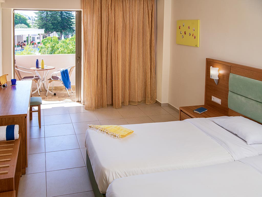 Ialyssos Bay har værelser i varme og glade farver med frisk og indbydende indretning både i bungalows og i hovedbygningen.