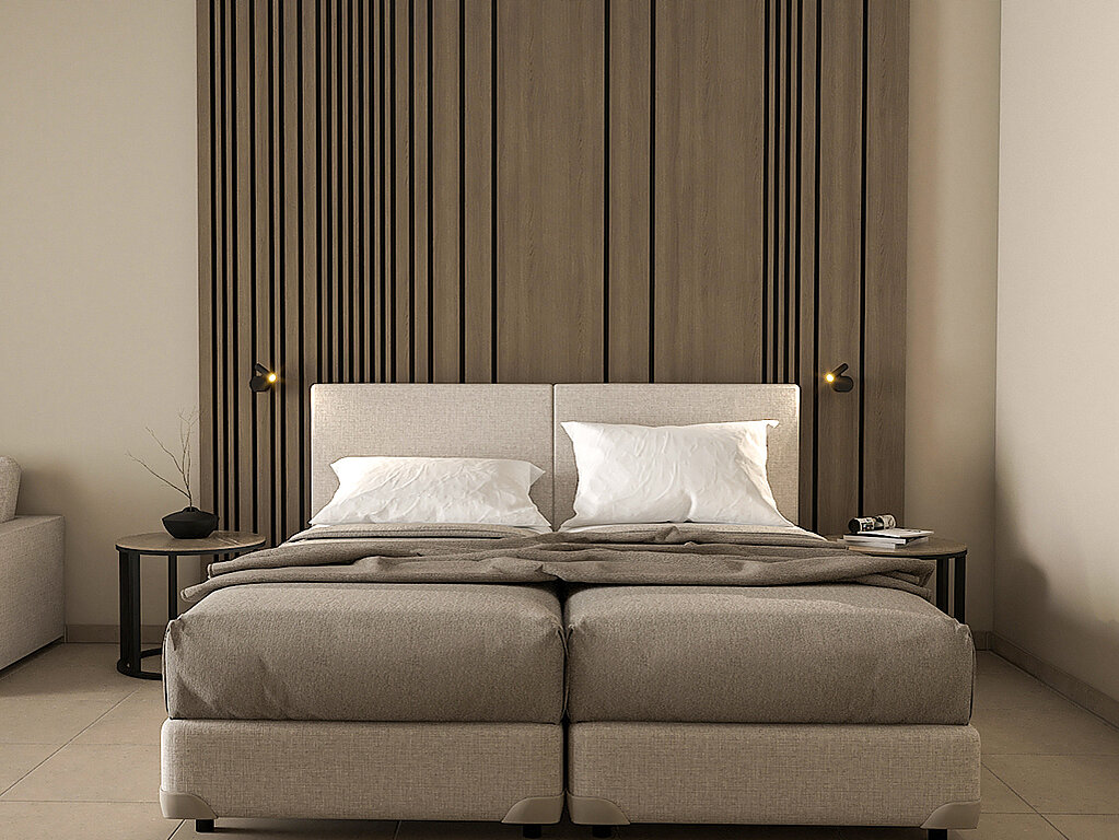 De rummelige dobbeltværelser er indrettet med dejlige farver og der er plads til op til tre personer. Værelserne er 34 m² og der findes en stor balkon eller terrasse på samtlige værelser. Værelset har to rigtige sengepladser, og hvis I er tre personer, sover den tredje person i sovesofa. Dette værelse kræver minimum to fuldt betalende og der er mulighed for at få én børnepris. Værelset kan bestilles som enkeltværelse mod ekstra tillæg.
