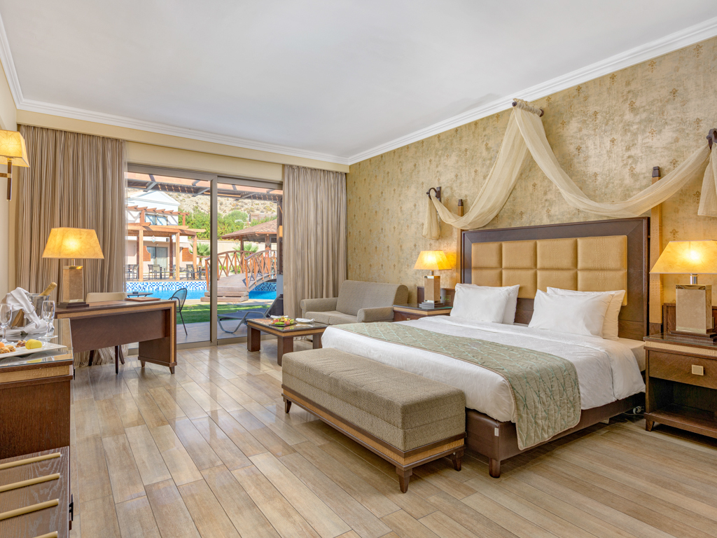 Deluxeværelset med pooludsigt i stueetagen er 46 m² og her er masser af plads. Der er to rigtige sengepladser og en sovesofa på 190x110 cm. Denne værelsestype ligger i afdelingen, som er forbeholdt voksne, og man skal være mindst 16 år gammel for at bo her. I denne lidt mere luksuriøse værelsestype får du privat check-in, velkomstdrink, mulighed for tidlig check-in og sen check-out (hvis der er ledige værelser), mulighed for at besøge á la carte restauranterne hver aften, uden ekstra omkostninger, såfremt der er plads – husk at bestil plads en dag i forvejen. For gæsterne i denne værelsestype er der også mulighed for morgenmad i en separat restaurant med buffet. Værelset kræver mindst to fuldt betalende og der kan max. bo tre voksne.