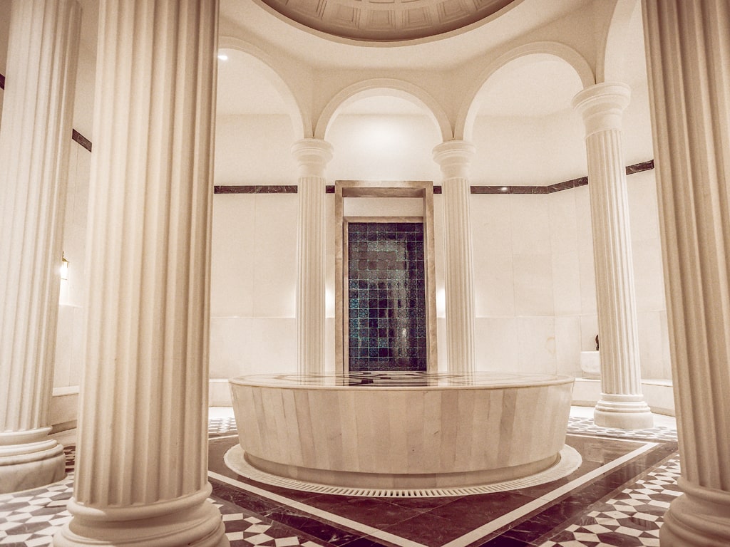 Der er en dejlig indendørs pool og mange hyggelige kroge og hjørner, hvor man kan slappe af mellem behandlingerne. Saunaen, poolen og det tyrkiske bad kan benyttes uden betaling.