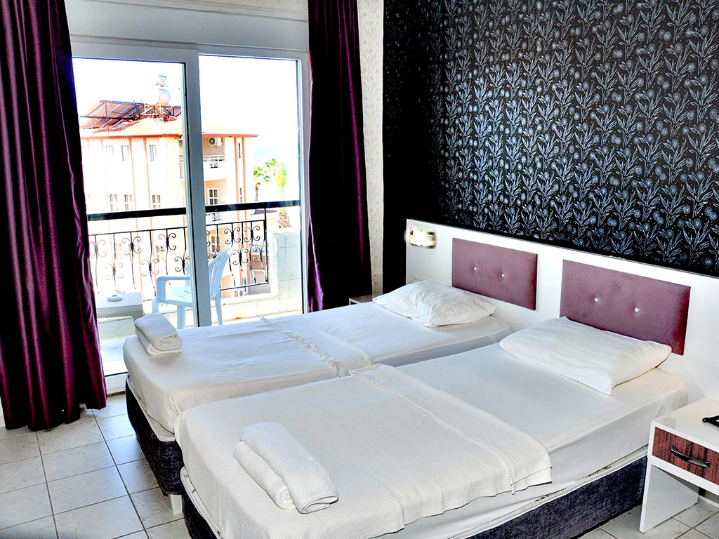 Værelser på Saygili Beach Hotel er lyst indrettede med hvide møbler og trædetaljer. Væggene er beklædt med mørkt tapet i skarp kontrast til lyset. Alle værelser har balkon og klinkegulv.