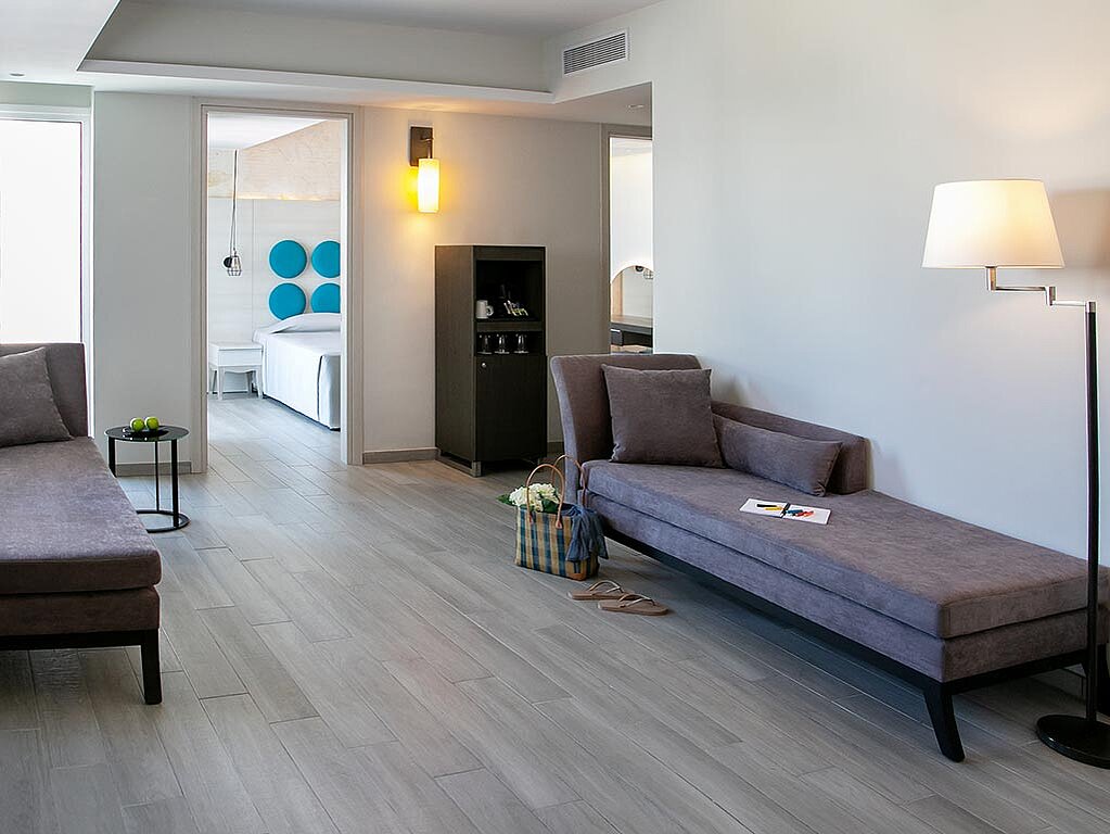 I familiesuiten på 40 m² findes to rigtige sengepladser og to ekstrasenge i form af sovesofaer, som hver måler 80x180 cm. Ved behov sættes der en ekstra seng ind, som måler 200x90 cm. Værelset kræver mindst to fuldt betalende, her kan bo maks. fire voksne og det er muligt at få børnepris til ét barn. Du kan vælge at opgradere landudsigten til pooludsigt mod et tillæg. Familiesuiten kan bestilles som et enkeltværelse mod et tillæg.